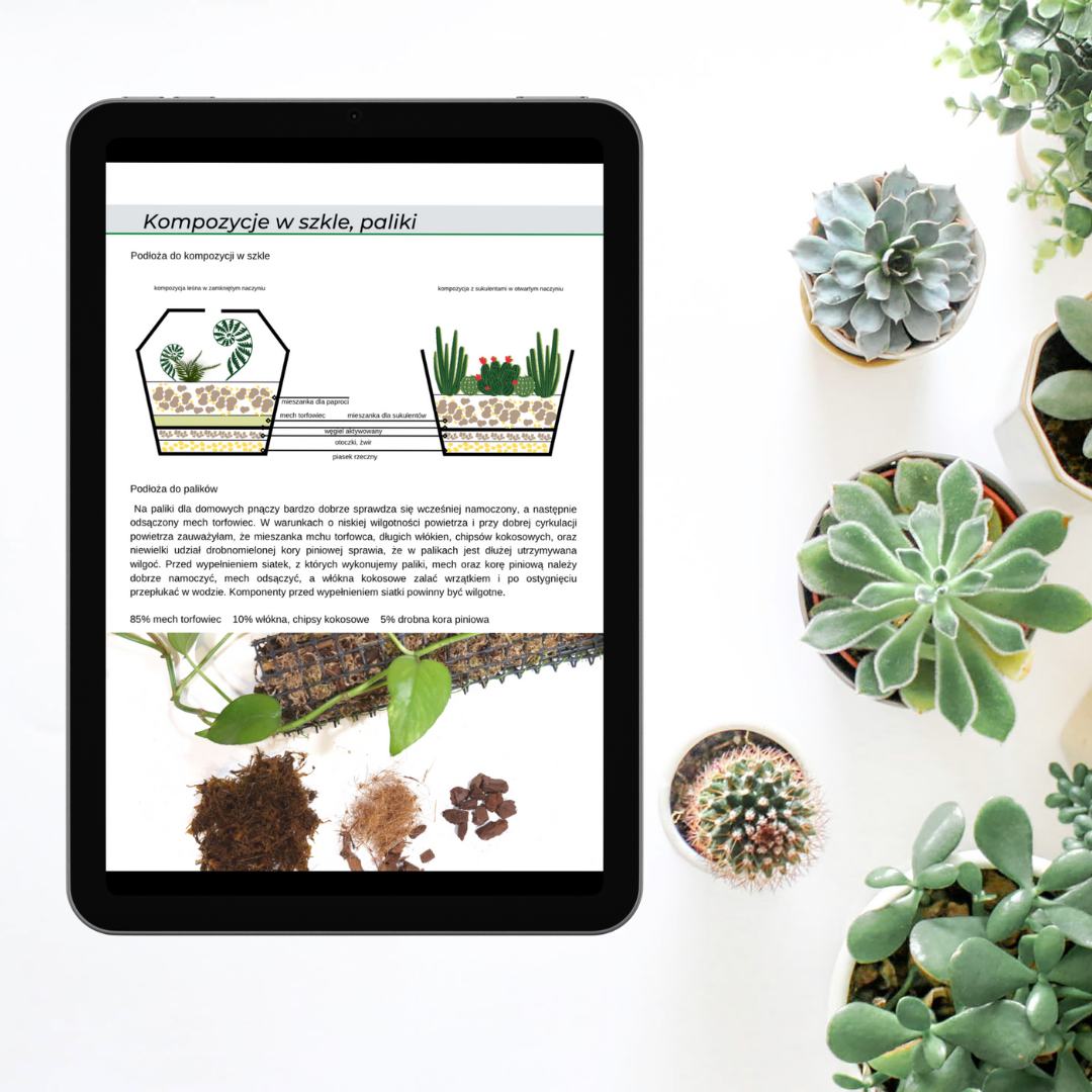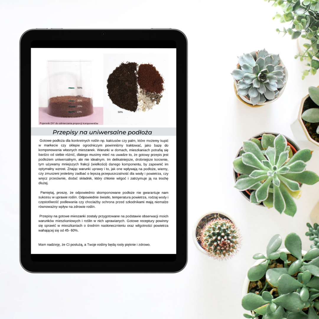 E-book “Przepisy Na Podłoża Dla 115 Gatunków Roślin Domowych” zawiera gotowe receptury na mieszanki, które pomogą Twoim roślinom zdrowo rosnąć i prawidłowo się rozwijać.