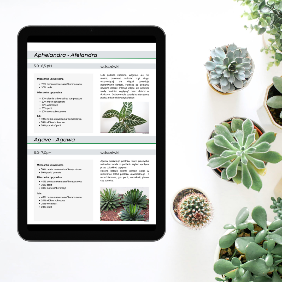 E-book oferuje gotowe receptury na mieszanki podłoża dostosowane do potrzeb 115 gatunków roślin domowych. Od popularnych fikusów i aloesów po rzadziej spotykane rośliny, takie jak mulenbekia czy strobilant – każdy znajdzie coś dla siebie!